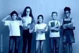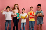 Multinational group of kids with books and notebooks ready for school on pink studio background