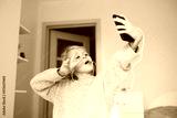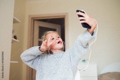 kid blogger using smartphone and video chating or streaming with friends, funny face and pose, online communication concept