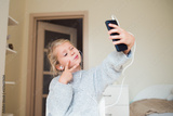 kid blogger using smartphone and posing on camera, funny face and pose, online communication concept