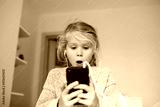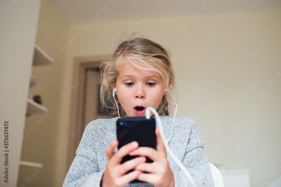 Funny girl surprised face, looking at her phone. Video chating or streaming, using modern tecnology