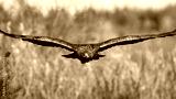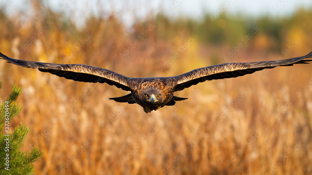 Magnificent golden eagle, aquila chrysaetos, flying over the field in autumn. Proud brown feathered animal looking to the camera with spread wings approaching from font. Wild bird of prey landing in