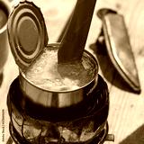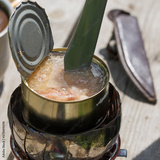 Camping gas stove portable for tourism travel and outdoor hiking. An open jar of boiling canned meat stewed meat warmed food, lunch in nature