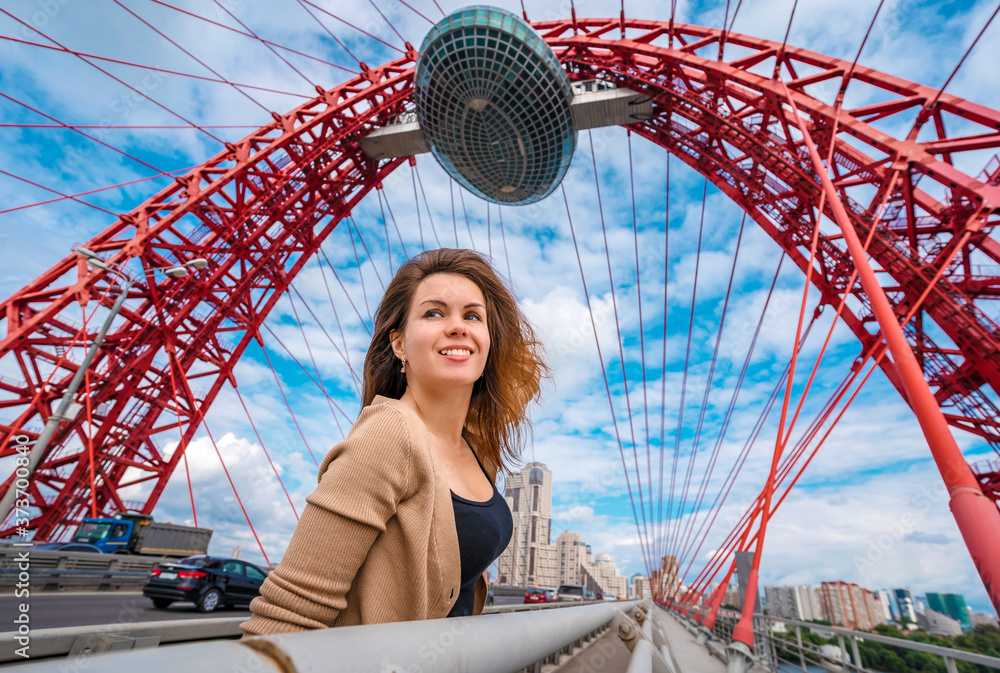A young woman with long hair stands with a view of the picturesque red bridge in Moscow