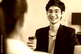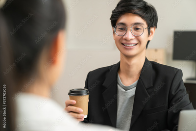 Charming Asian businessman holding a coffee cup in hand and smile while talking to friends.