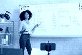 Online lesson for students. Smiling girl points at blackboard and teaches english at webcam