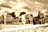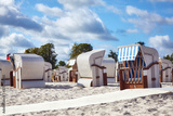 Wicker beach basket chairs on a beach in Ueckermunde, Germany.