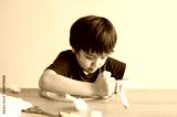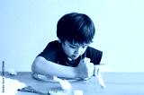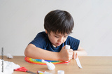 Kid putting glue stick on paper for sticking cotton wool as decorative elements for clouds on rainbow. Child Boy enjoy art activity at home. home schooling and distance learning concept