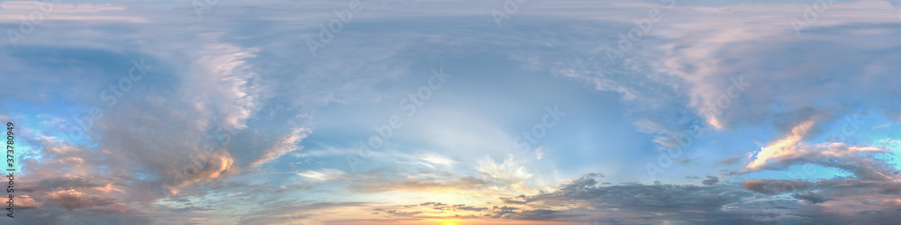 hdr panorama of sunset sky with clouds without ground, for easy use in 3D graphics and panorama for composites in aerial and ground spherical panoramas as a sky dome.