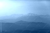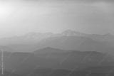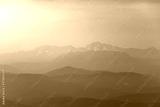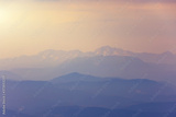 Silhouettes of snow mountains by the sea in the evening light with haze in the atmosphere.