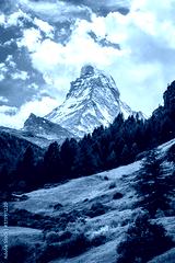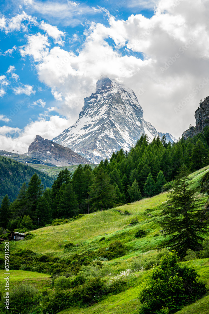 Vertical scenic view of the Matterhorn mountain summit with snow clouds blue sky and nature during summer in Zermatt Switzerland