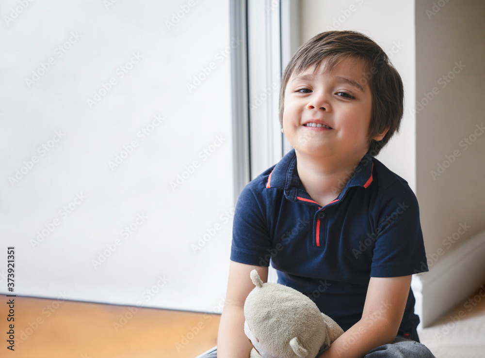 PPortrait of happy kid sitting on wooden floor playing with teddy bear, Cute boy play with his soft toy, Positive child relaxing at home. child stay at home during covid-19,Social Distancing