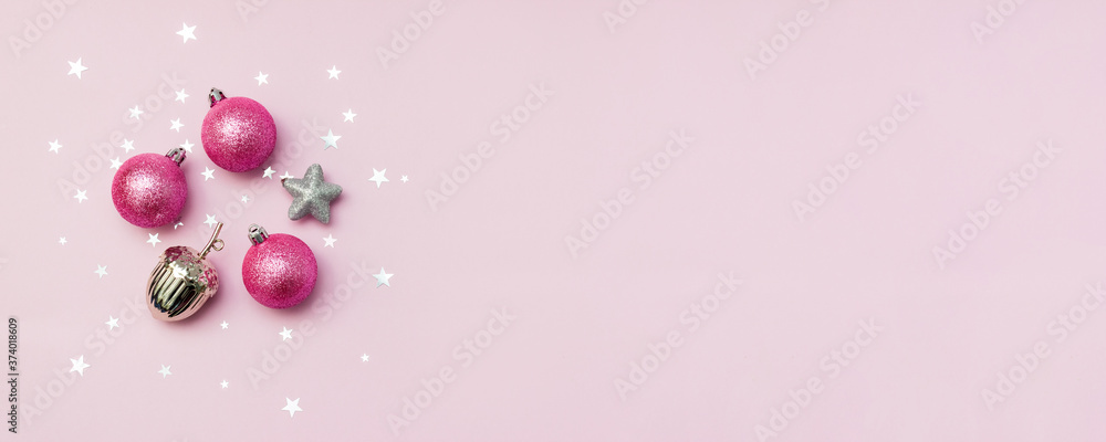 Silver and pink Christmas decorations on pink background with star confetti. New Year concept. Selective focus.