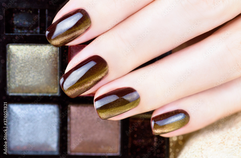 Cat Eye Nail Art. Manicure golden brown on a Gold background. Female fingers with golden brown Nails holding eyeshadow palette.