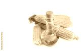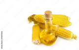 Corn oil in a carafe, peeled corn cobs and grains, text space isolated on a white background