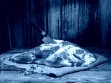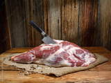 On a wooden table lies a raw leg of mutton on the bone pierced with a kitchen knife . Sheep meat with spices, close-up.A fresh piece of mutton. Horizontal view.Rustic style.
