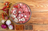 Boneless lamb steak, sliced and marinated with onions, meat in a glass bowl, Basil, chili peppers, marinades on a wooden table, top view, close-up,selective focus