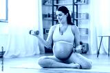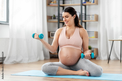 pregnancy, sport and fitness concept - happy pregnant woman with light dumbbells exercising at home