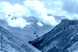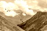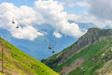 Cabins on the cable car above the mountain forest on the slopes of the ridge.