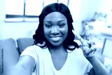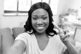blogging, gesture and people concept - happy smiling african american woman taking selfie and peace hand sign at home