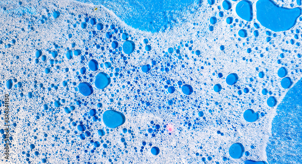 water white soap foam on blue background.