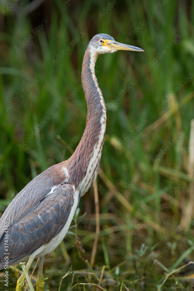 Profile of great blue heron posing for portrait facing right.