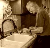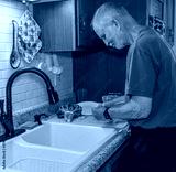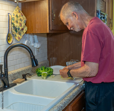 Senior man begins preparing vegetables for stirfry dinner made a home