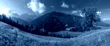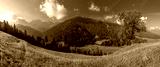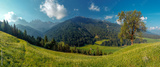 Beautiful natural landscape in the summer time. View on majestic mountains, grassy hills with fresh green grass and alone tree under sunlit. Rural perfect scene of nature. sunny morning of countryside