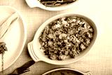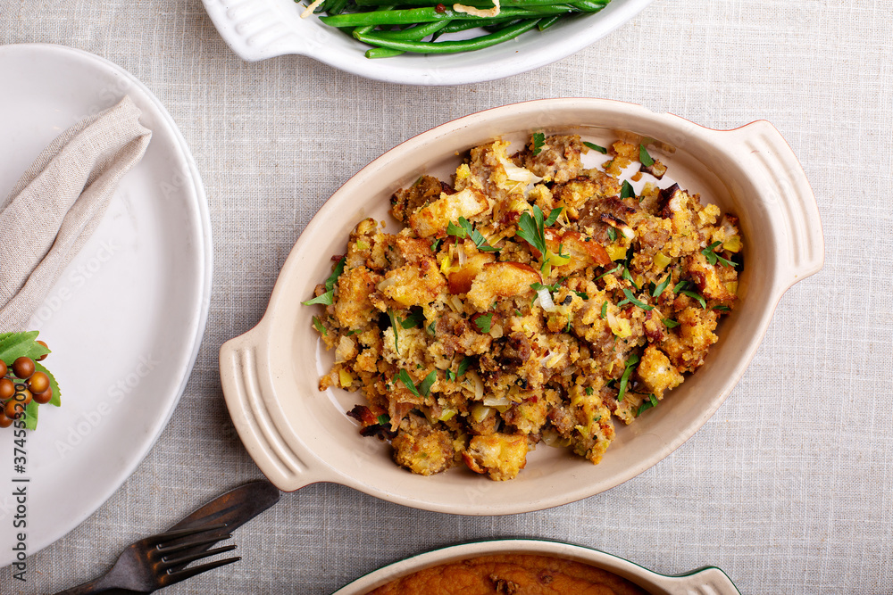 Traditional Thanksgiving side dish, cornbread stuffing in a baking dish