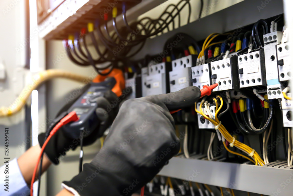 Electrical engineer using digital multi-meter measuring equipment to checking electric current voltage at circuit breaker and cable wiring system in main power distribution board.