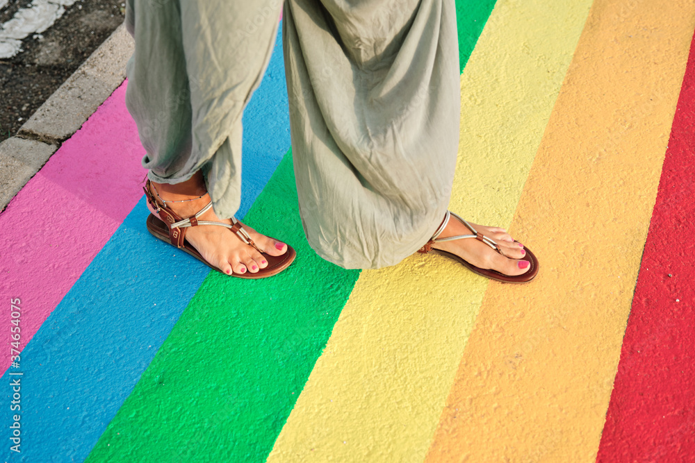 unrecognizable woman feet crossing gay rainbow colors on the street