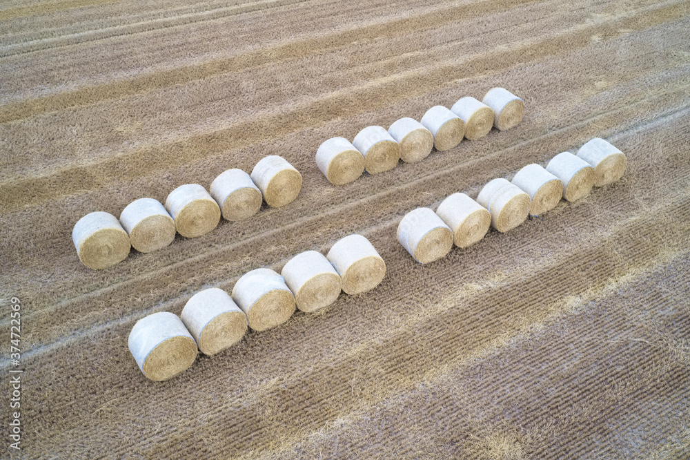 Hay crop bales rolled in field by farmer on farm for harvesting