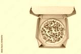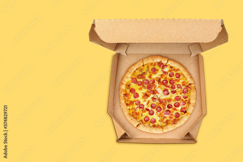 Pepperoni pizza in brown take-out box on yellow background.