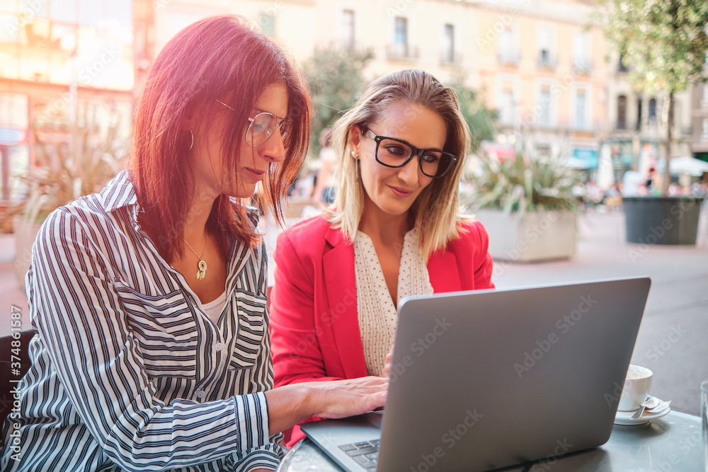 two adult businesswomen working outdoors with laptop