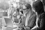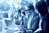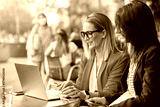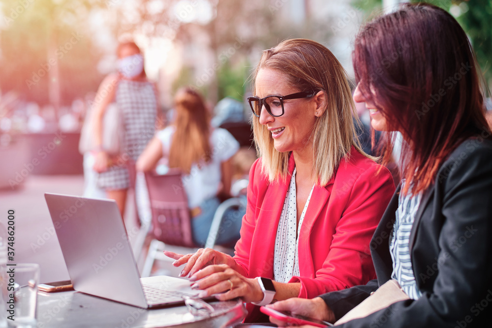 two adult businesswoman working outdoors with laptop
