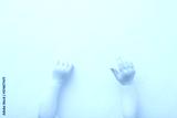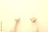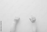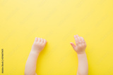 Baby hands on yellow table background. Closeup. Point of view shot. Top down view.