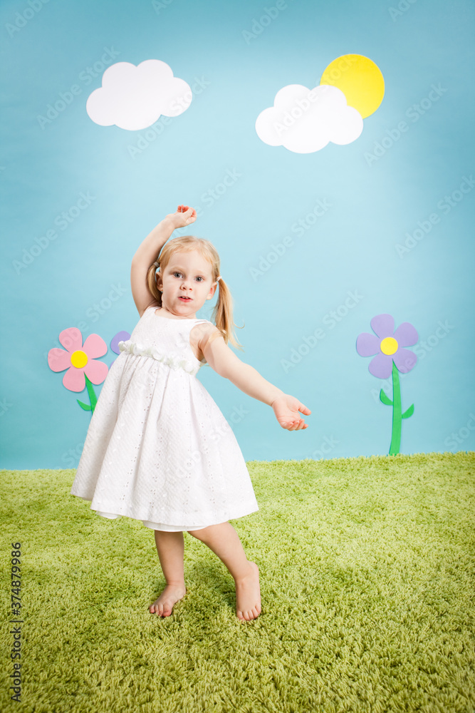Happy Little Girl Dancing in Imaginary Outside Wonderland World