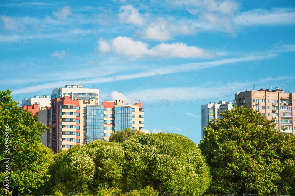 Green summer park with young oaks and willows. In the background, multi-storey residential buildings in an ecologically clean area for the population.