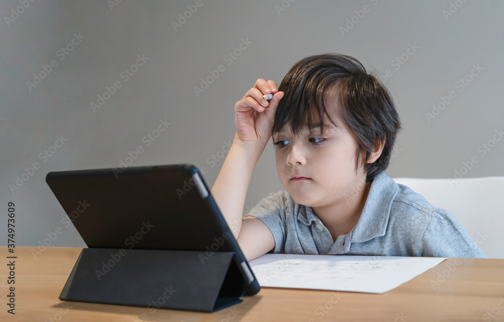 Kid self isolation using tablet for his homework,Child doing using digital tablet searching information on internet during covid 19 lock down,Home schooling,Social Distance,E-learning online education