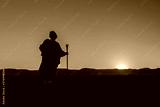 Dervih or monk Is walking to sunset on sandy desert.