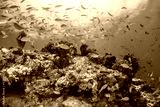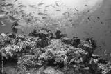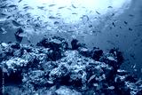 Underwater tropical reef scene, schools of small fish swimming together in blue water among colorful coral reef in The Maldives, Indian Ocean