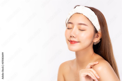 Attractive beautiful young asian woman close eyes with happy and smile face. Charming beautiful young female has beauty facial skin. beauty skin care, spa concept with white background, copy space