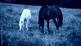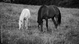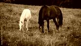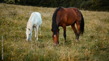 Two arabian horses grazing on the meadow. Free horse on pasture