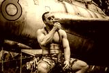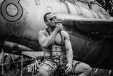 Old war airplane in the abandoned airport and brutal naked soldier near it. American bodybuilder smoking cuban cigar in the field.