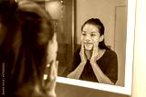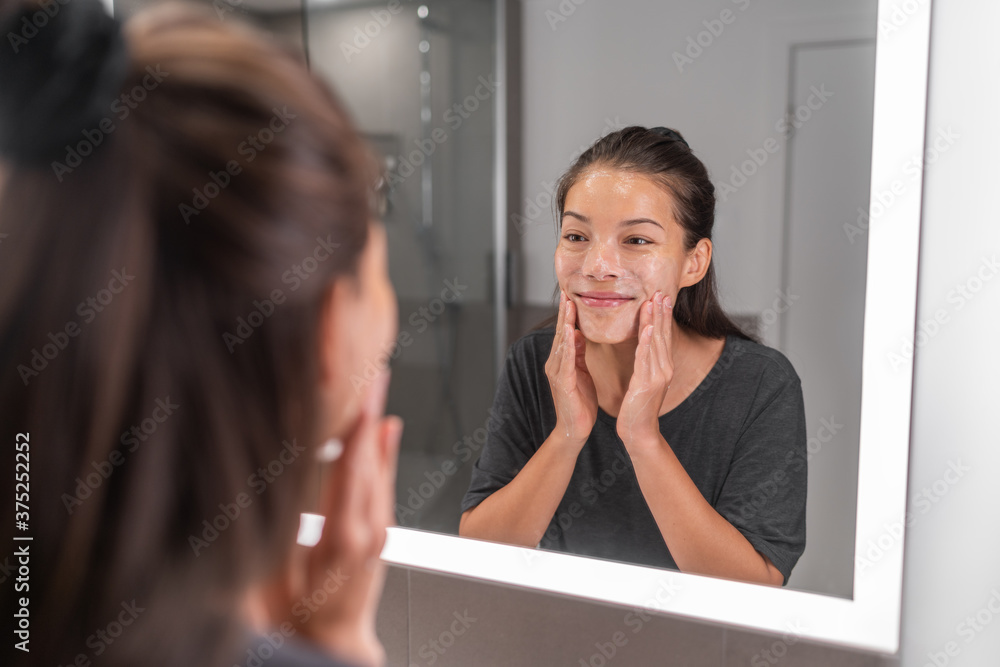 Woman washing face morning beauty skincare routing happy using soap foam in LED lighted mirror. Asian young girl massaging facewash exfoliate scrub product.