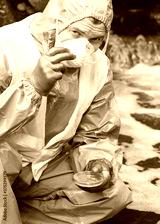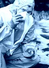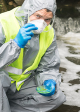 a man in a protective suit holds a petri dish with a sample for research and took off his glasses to look forward
