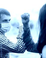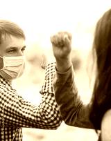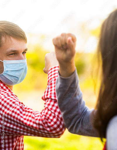 Couple greeting with elbows. Elbows bump. Coronavirus, illness, quarantine, medical mask, COVID19