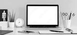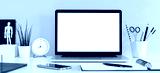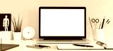 Laptop with white screen on a desk against yellow wall. Home office table.