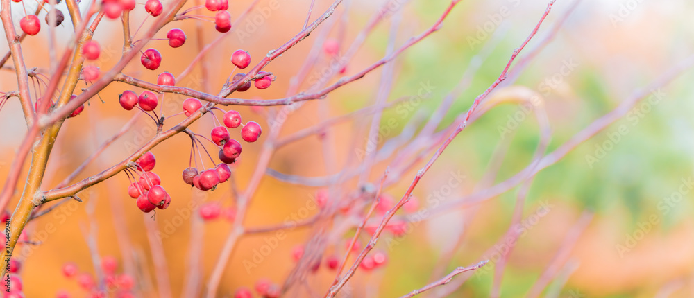 Beautiful panoramic autumn scenery with colorful leaves, berries and bokeh background