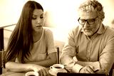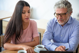 Serious male and female colleagues or partners of different ages meeting over cup of coffee at co-working, sitting at open laptop, watching and discussing presentation on laptop. Teamwork concept