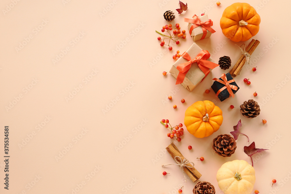 Autumn composition with orange pumpkin ,pine cones, cinnamon sticks, berries and small gifts. Flat lay, top view.秋の背景 オレンジかぼちゃとプレゼント